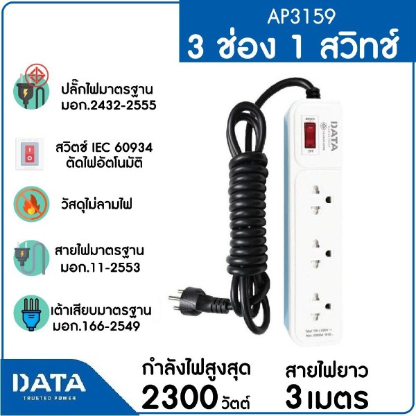 DATA ปลั๊กไฟ มอก. AP3159 3ช่อง 1สวิตซ์ 3ม. สีเทา